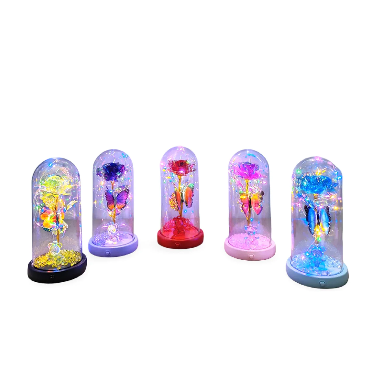 Bu zarif fanus, cam kubbe içerisinde sonsuzluğu simgeleyen parlak bir gülü barındırır. Gülün etrafını saran peri ışıkları, odanıza sıcak ve davetkar bir ışıltı yayarken, fanusun içindeki renkli kelebek figürü bu özel parçaya masalsı bir hava katar. Farklı renk seçenekleri sayesinde her zevke uygun bir alternatif bulunur; canlı kırmızıdan huzur veren maviye, romantik pembeden gizemli mora kadar birçok büyüleyici gül rengi mevcuttur. Alt kısmındaki dekoratif tanecikler ve bazı modellerdeki sevimli ayı biblosu detayı, ürünün çekiciliğini artırır.