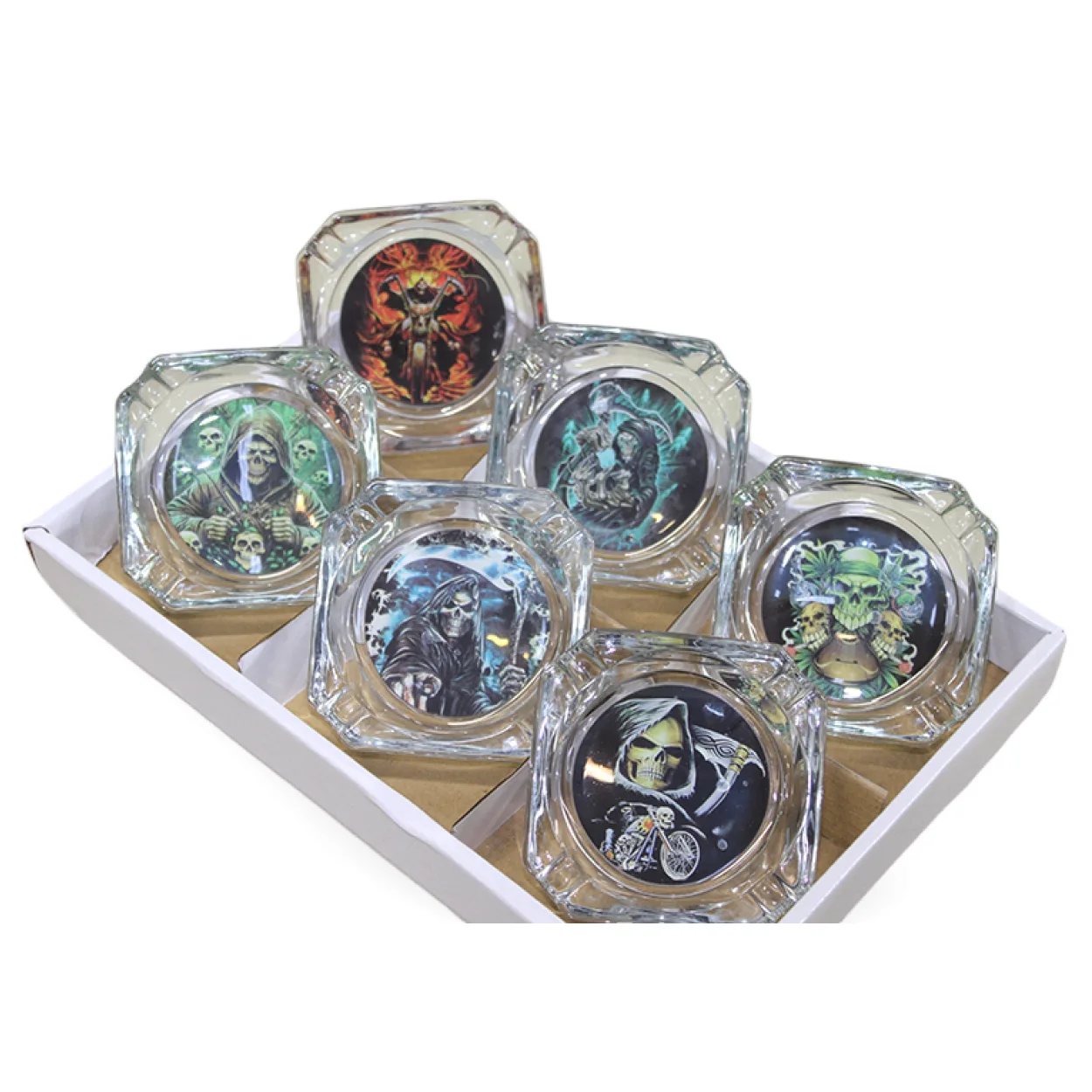 Karanlık ve etkileyici tasarımları sevenler için özel olarak üretilen bu cam küllük, yaşam alanlarınıza benzersiz bir dokunuş katıyor. Her biri özenle seçilmiş gotik temalı görsellerle süslenmiş olan küllüklerimiz, kafatası, azrail, motorsiklet ve fantastik yaratık figürleriyle dikkat çekiyor. Sadece bir küllükten çok daha fazlası; aynı zamanda göz alıcı bir dekorasyon objesidir.