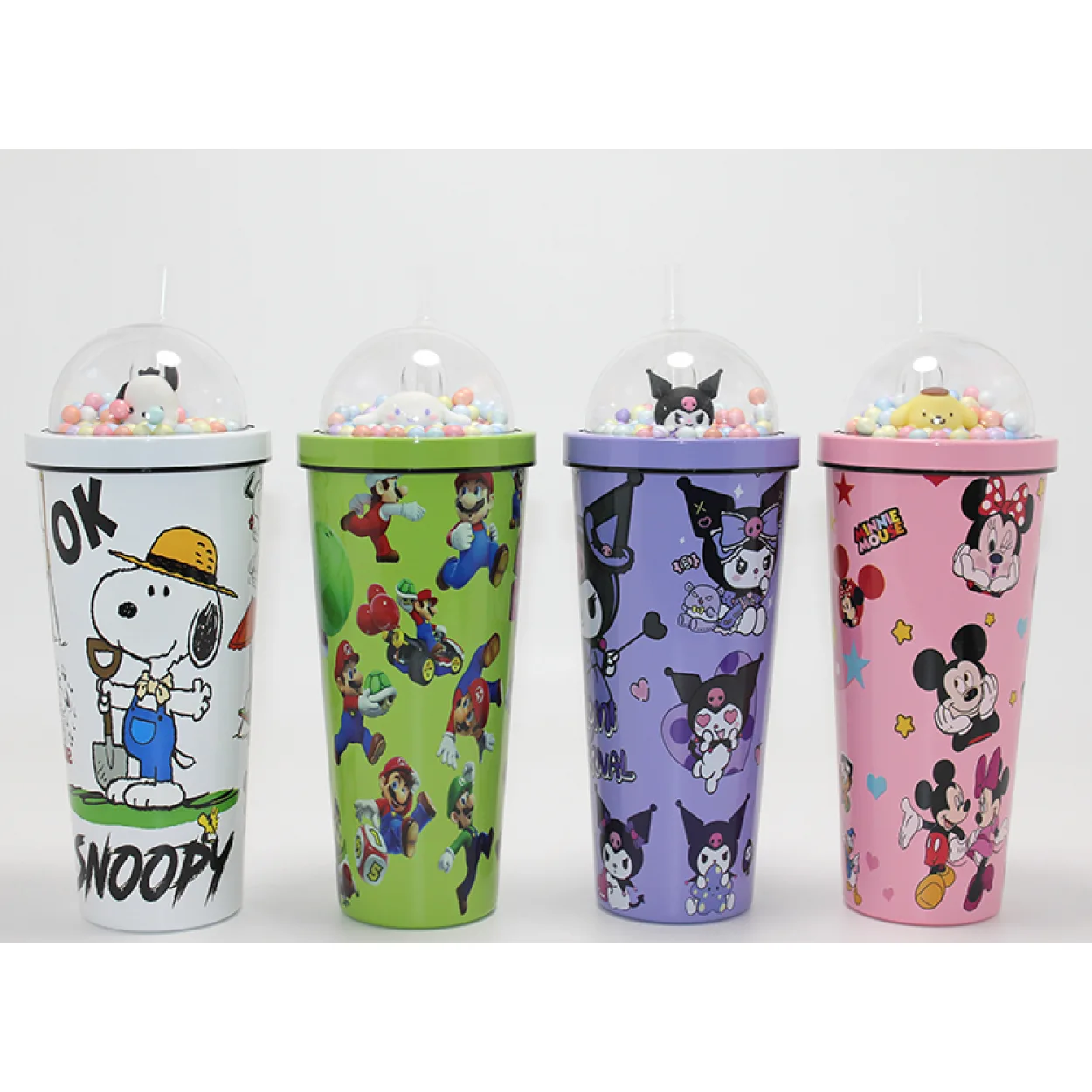 Karakterli Pipetli İçecek Termosu – Snoopy, Mario, Kuromi, Mickey Temalı Şeffaf Kubbeli Suluk