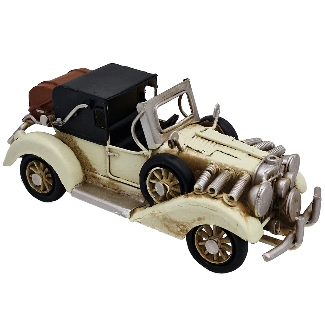 Mekanlarınıza nostaljik bir dokunuş ve otantik bir hava katmak için tasarlandı! Bu küçük boy metal dekoratif klasik araba maketi, özenle uygulanmış eskitme detayları ve kendine has roadster/cabriolet tarzıyla dikkat çekiyor. Krem rengi gövdesi, siyah açılır tavan detayı, belirgin motor aksamları ve arka kısmındaki sevimli bavuluyla geçmişin büyüleyici atmosferini evinize ve ofisinize taşıyor.