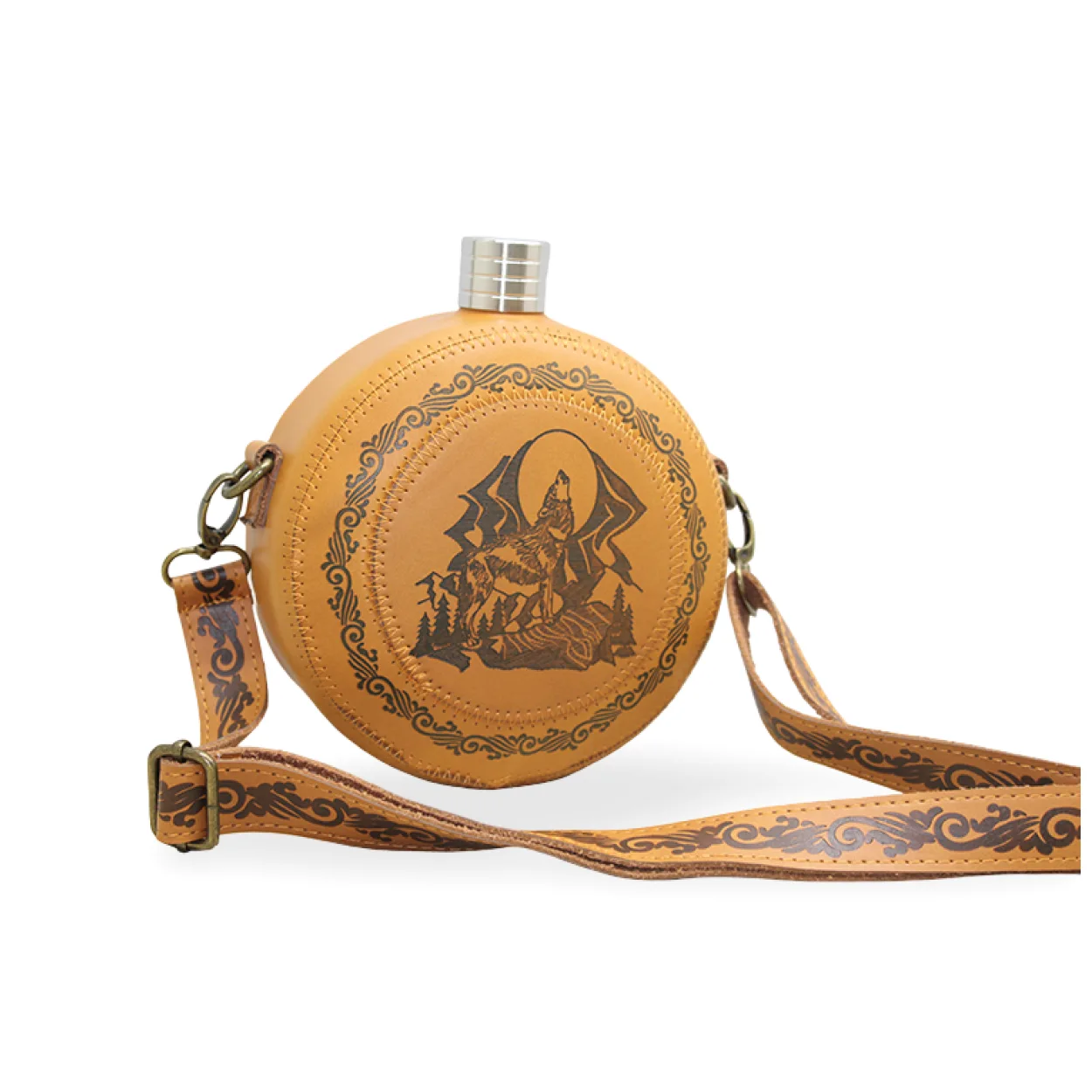 Kurt Desenli El Yapımı Hakiki Deri Kılıflı Seyahat Matarası