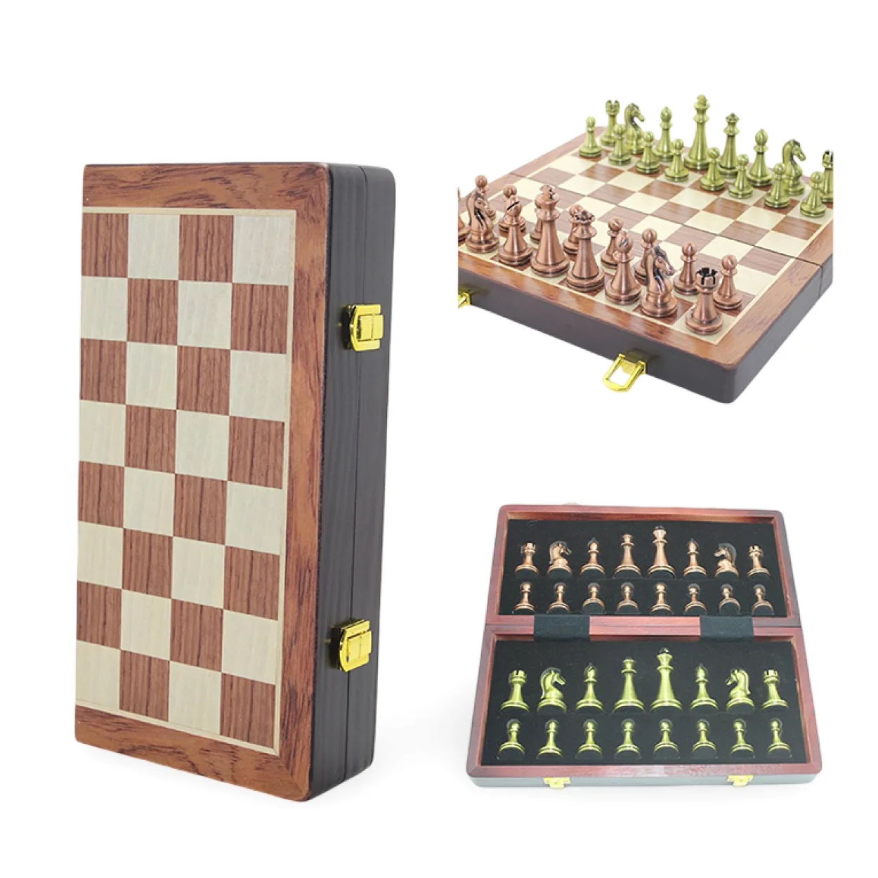 Lüks Ahşap Katlanabilir Satranç Takımı - Hazneli Metal Taşlı Seyahat Seti