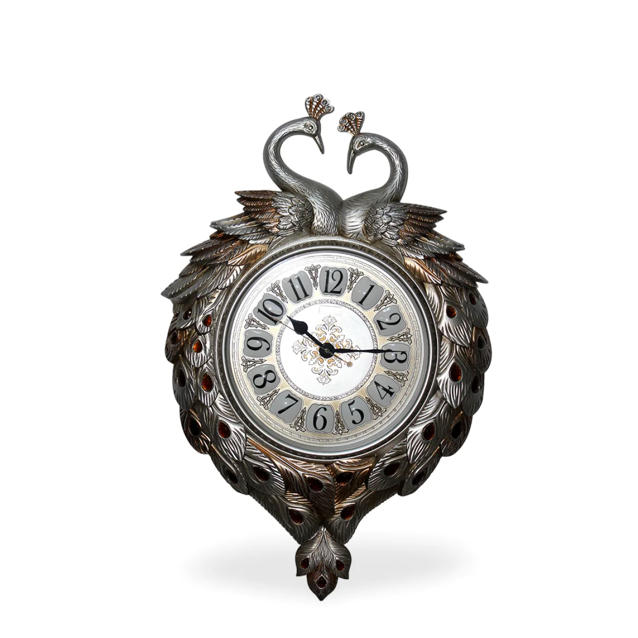 Bu özel duvar saati, en üst düzeyde dayanıklılık ve estetik sunmak amacıyla 1. derece kaliteli polyester malzemeden özenle üretilmiştir. Bu sayede uzun yıllar boyunca ilk günkü parlaklığını ve formunu korur. El işçiliğiyle bezenmiş karmaşık tüy detayları ve bronz-gümüş renk geçişleri, her bir ayrıntıda kaliteyi hissettirir. Kadran etrafındaki amber renkli taşlar, saatin genel estetiğine zengin bir dokunuş eklerken, klasik ve modern dekorasyon tarzlarıyla mükemmel uyum sağlar.