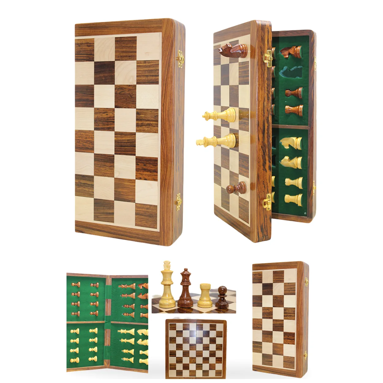 - Katlanabilir Ahşap Kutu: Satranç tahtası, kolayca katlanabilen ve içerisine tüm taşları düzenli bir şekilde depolayabilen zarif bir kutu formundadır. Yeşil kadife astarlı özel bölmeler, taşların güvenle saklanmasını ve çizilmesini önler.