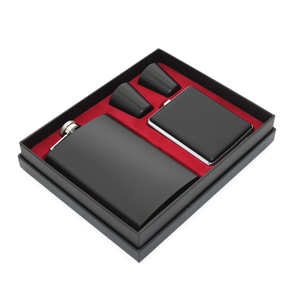Lüks Mat Siyah Paslanmaz Çelik 9 Oz Matara Seti: 2 Shot Bardağı ve Sigara Tabakalı Seyahat Kiti