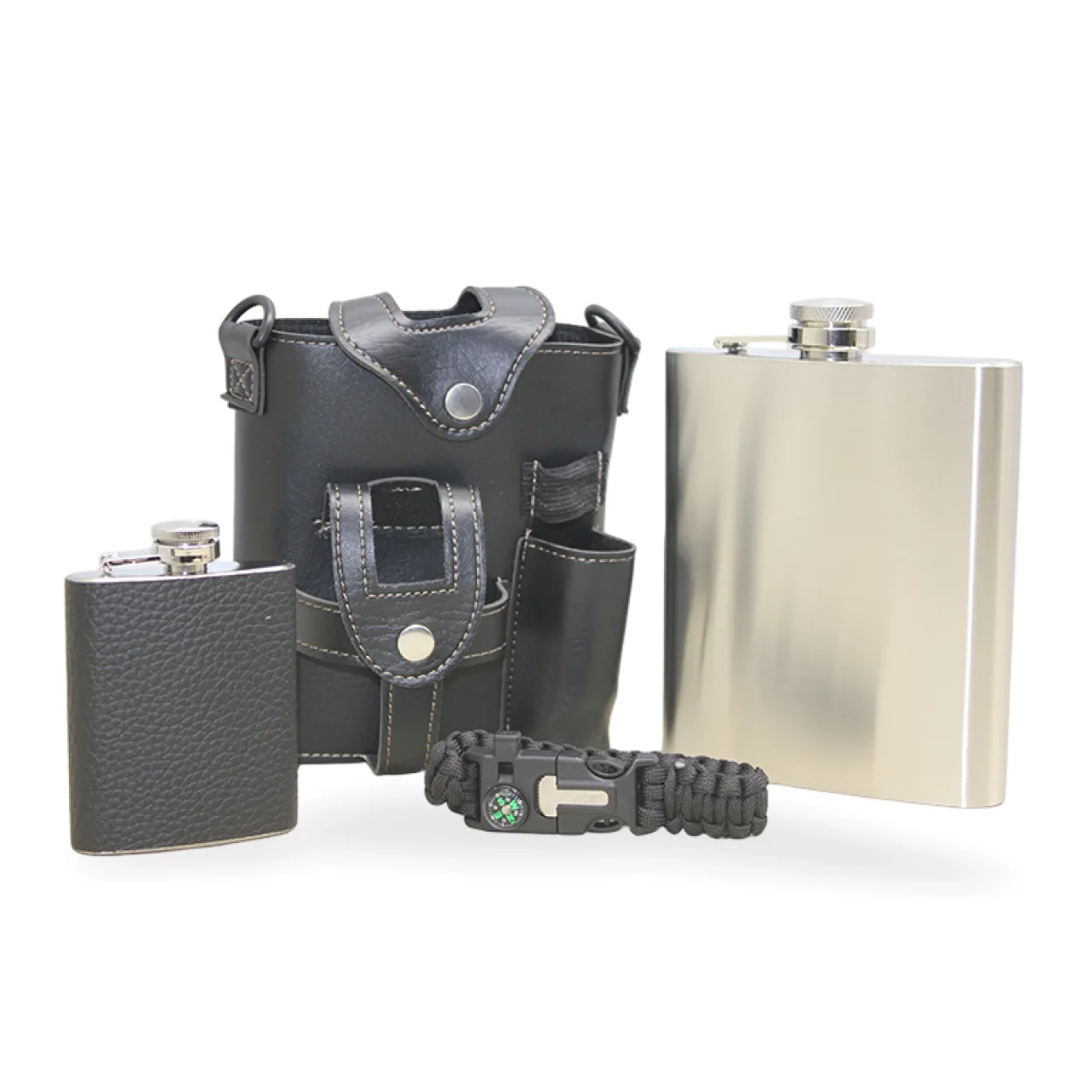 Lüks Paslanmaz Çelik Deri Kılıflı Matara Seti: Cep Boy Flask, Paracord Bileklik Hediye