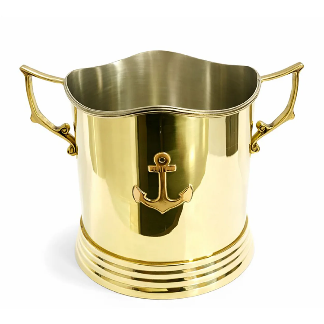 Zarafeti ve fonksiyonelliği bir araya getiren bu lüks pirinç buz kovası ile sofralarınıza ve bar köşelerinize deniz esintisi katın. Parlak altın rengi pirinç gövdesi, dikkat çekici çapa deseni ve ergonomik çift kulplarıyla her türlü içecek sunumunuzda fark yaratacak.