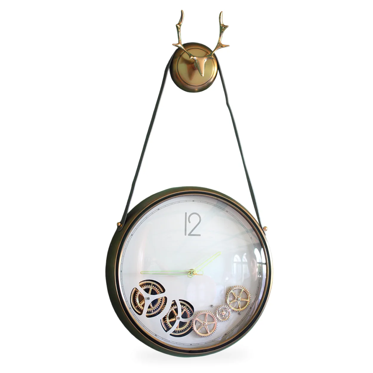 Bu duvar saati, 1. Derece Kaliteli Metalden üretilmiştir, bu da ona dayanıklılık ve uzun ömürlü bir kullanım vadeder. Saatin alt kısmında yer alan işleyen çark mekanizması, saatin sadece bir zaman ölçer olmanın ötesine geçerek dinamik bir sanat eserine dönüşmesini sağlar. Üst kısmındaki zarif geyik biblosu ve onu tutan metal kayışlar, saatin genel tasarımına rustik ve modern bir denge getirir. Şeffaf ön yüzeyi sayesinde iç mekanizma rahatlıkla görülebilir, bu da saati daha da ilgi çekici kılar.