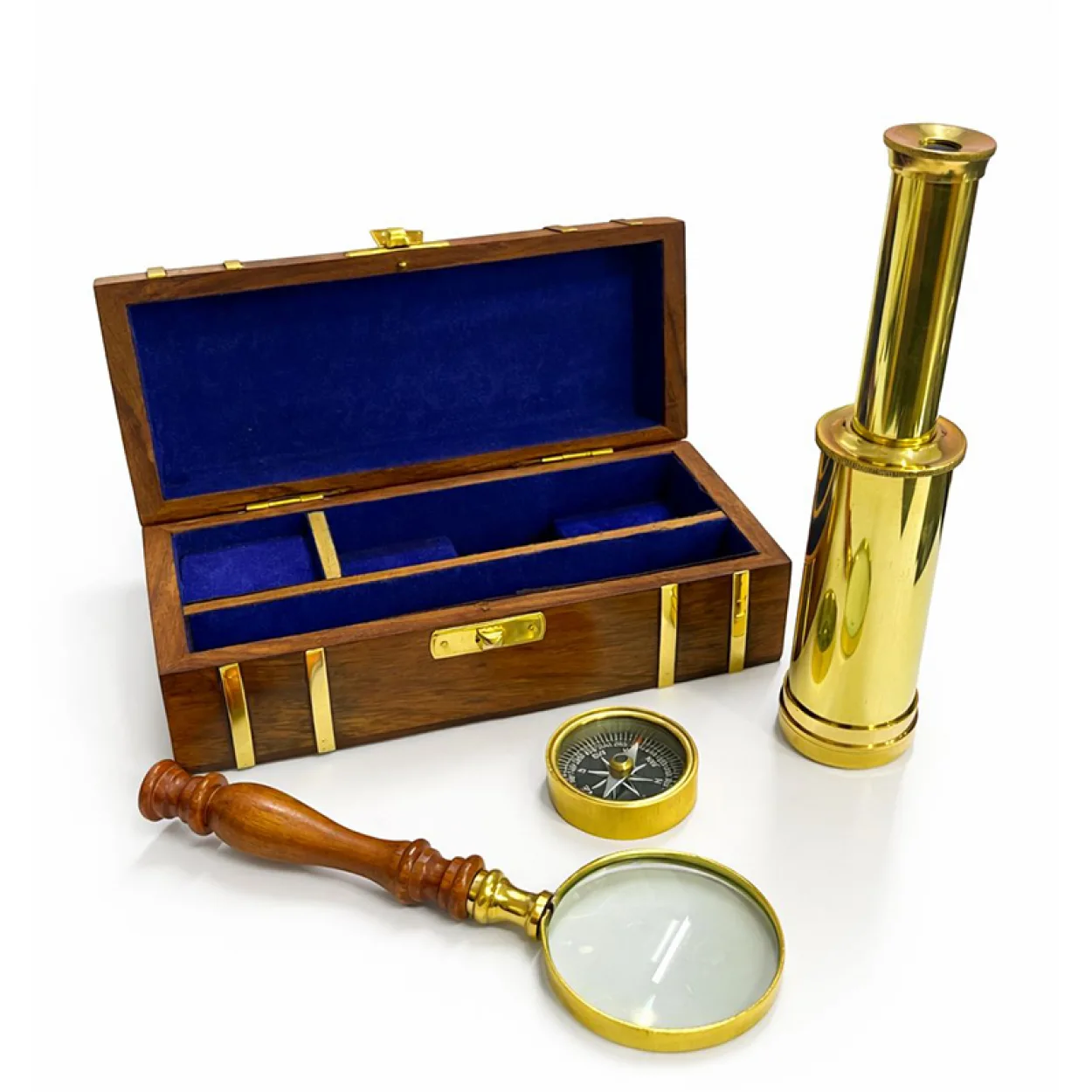 Nostaljik Ahşap Kutuda Pirinç Dürbün, Pusula ve Büyüteç: Antika Kaşif Seti