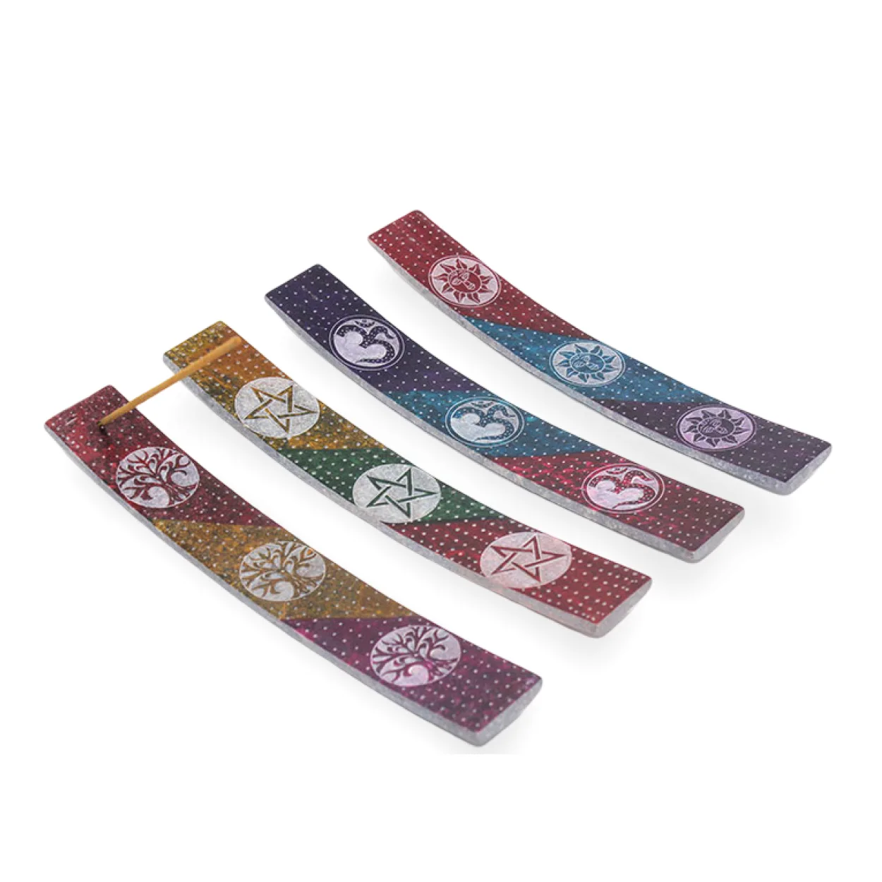 Üzerinde yer alan çeşitli ruhsal semboller; yaşam ağacı, pentagram, Om ve güneş/triskelion motifleri gibi kadim işaretleri barındırır. Bu semboller, derin anlamlar taşıyarak çakra dengeleme, koruma ve içsel huzur arayışınıza eşlik eder. Her bir tütsülük, farklı renk bölgeleri ve üzerinde özenle işlenmiş gümüş tonlarındaki sembolleriyle benzersiz bir hikaye anlatır.