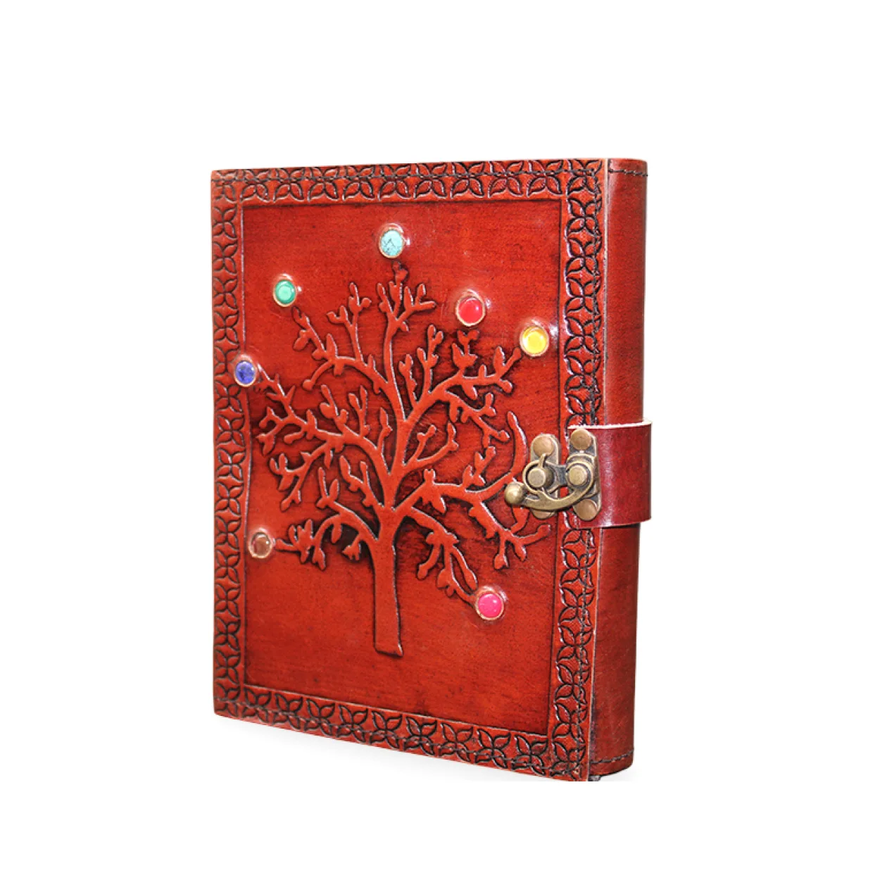 Otantik El İşçiliği Deri Defter, Renkli Doğal Taşlarla Bezenmiş Hayat Ağacı Motifli Günlük