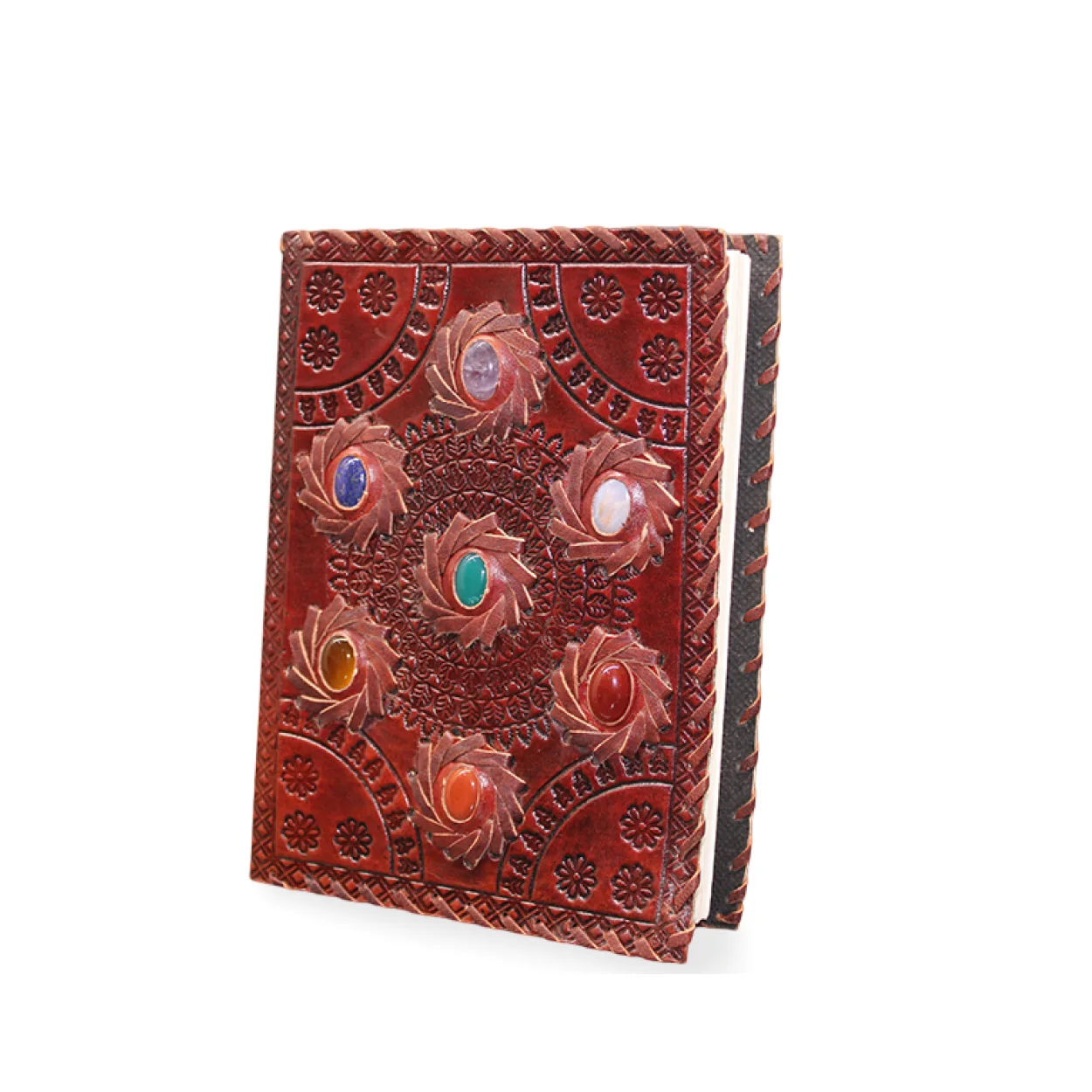 Bu eşsiz deri defter, notlarınızı, düşüncelerinizi ve anılarınızı saklamak için sanatsal bir yuva sunar. Geleneksel el işçiliği teknikleriyle üretilen bu defter, kaliteden ödün vermeden otantik bir estetik sunar. Dış yüzeyi, özenle işlenmiş hakiki deriden yapılmış olup, karmaşık kabartma desenlerle bezenmiştir. Her biri farklı bir renge ve enerjiye sahip olan yedi adet doğal taş detayı, deftere mistik ve çekici bir hava katmaktadır. Bu taşlar, spiral şekilli metal görünümlü detaylarla çevrelenerek adeta defterin ruhunu yansıtır.