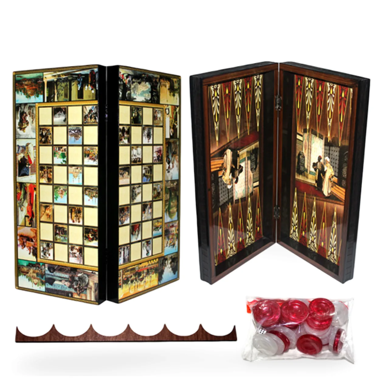 - Sanatsal Dokunuşlar: Tavla tahtasında geleneksel motiflerle zenginleştirilmiş, estetik bir derinlik sunan iç mekan sahneleri yer alırken, satranç tahtasının kareleri ve kenarları çeşitli sanatsal imgelerle süslenmiştir. Bu detaylar, ürüne eşsiz bir karakter kazandırır.
