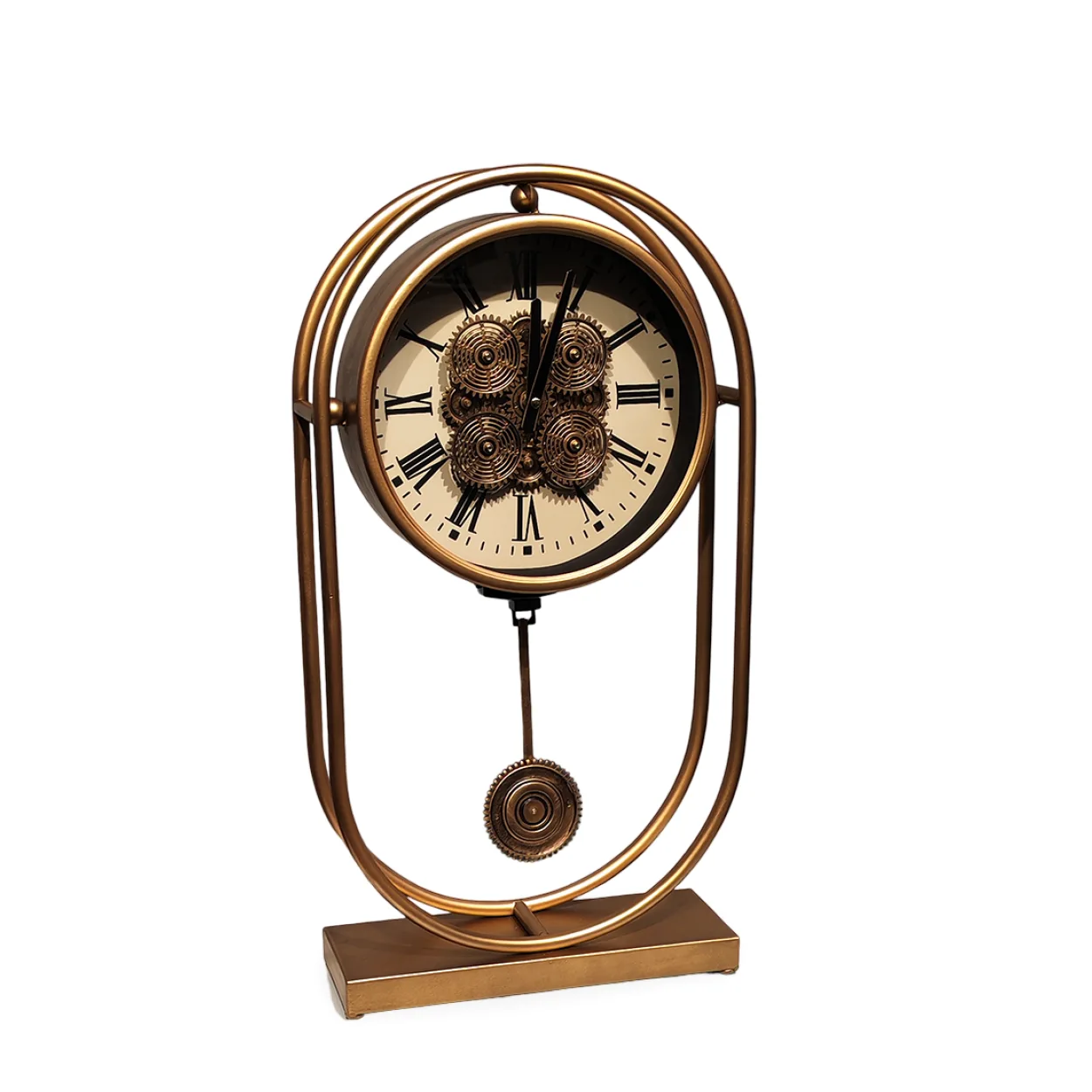 Estetik Tasarım: Antik bronz rengi metal çerçevesi ve görünen hareketli çark mekanizması ile endüstriyel şıklığı ve vintage cazibeyi bir araya getirir.