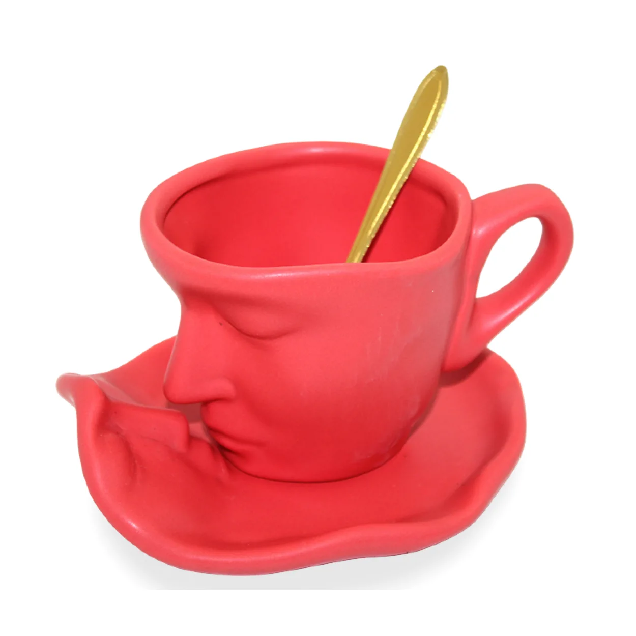 Geleneksel kupa bardak anlayışına meydan okuyan, estetik ve işlevselliği bir araya getiren bu özel tasarım kırmızı porselen kupa bardak ve tabağı ile kahve veya çay keyfinize sanatsal bir dokunuş katın. Yüz hatlarını, özellikle burun ve dudakları andıran detaylarıyla benzersiz bir görsel şölen sunan bu obje, içeceğinizi yudumlarken bile size ilham verecek.