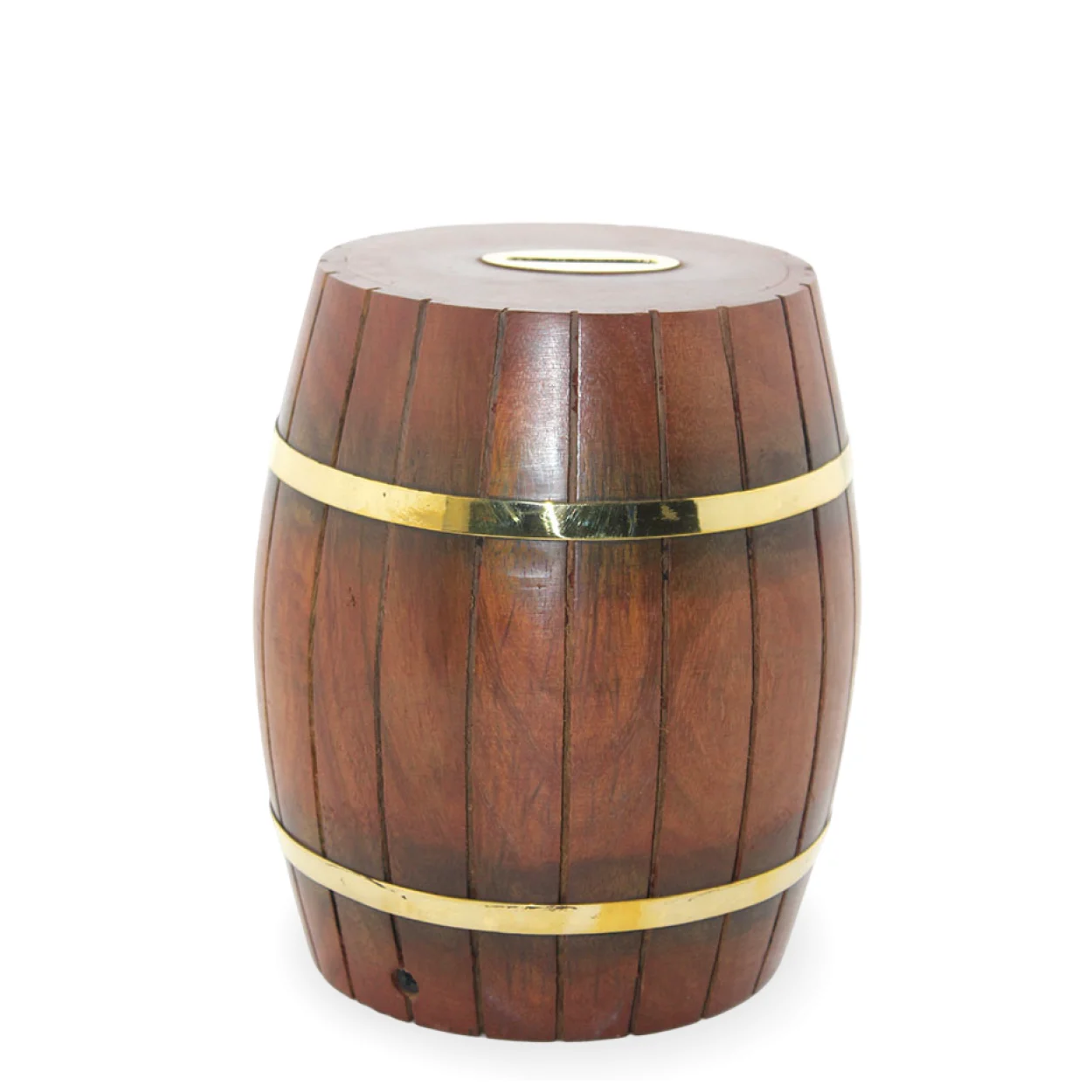 Pirinç Destekli Ahşap Fıçı Kumbara 18 Cm - Dekoratif Tasarruf Kutusu Hediyelik