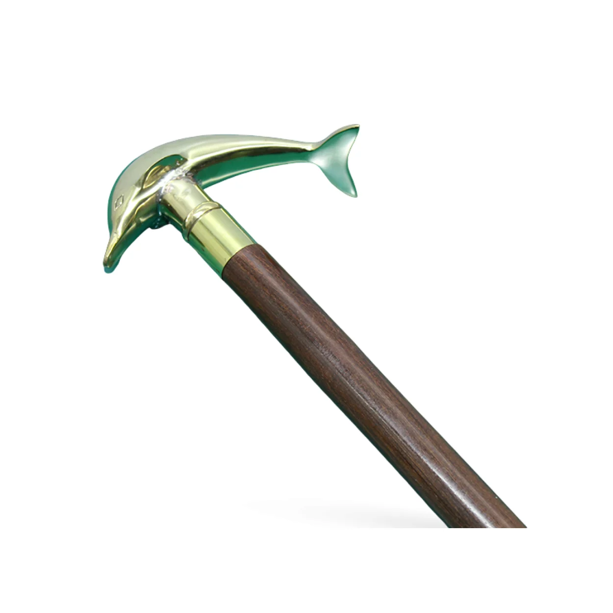 Bu özel bastonun en çarpıcı özelliği, parlak ve detaylı pirinçten imal edilmiş yunus balığı figürlü sapıdır. Yunusun zarif kıvrımları, suyun akışkanlığını ve yaşam enerjisini yansıtacak şekilde ustaca şekillendirilmiştir. Pirinç malzemenin kendine özgü altın tonlarındaki ışıltısı, bastona asil ve lüks bir hava katar. Başlığın ahşap gövdeyle birleştiği nokta da pirinç bir yüksük ile güçlendirilmiş olup, tasarım bütünlüğünü kusursuz bir şekilde tamamlar. Bu detay, ürünün sadece görsel olarak değil, yapısal olarak da ne kadar sağlam olduğunu gösterir.