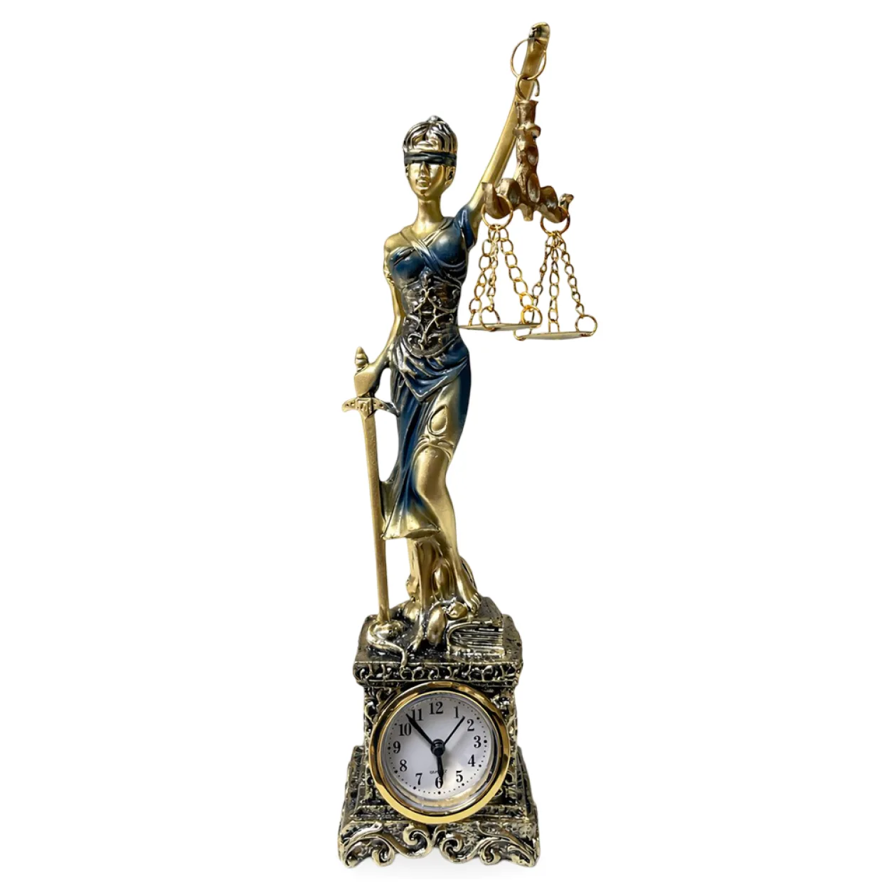 Hukukun sembolü Lady Justice'ı modern ve işlevsel bir dokunuşla mekanlarınıza taşıyın. Bu özel polyester saatli adalet biblosu, zarif tasarımı ve pratik kullanımıyla ofisinizde, çalışma odanızda veya evinizde dikkat çekici bir dekorasyon objesi olacaktır. Hukuk profesyonelleri için ideal bir hediye alternatifi veya adalet temasını seven herkes için anlamlı bir parça.