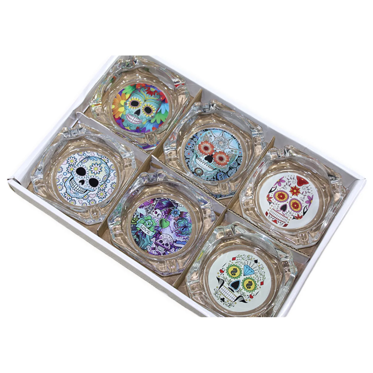 Bu boyutlar, küllüğün fazla yer kaplamadan her türlü ortama kolayca uyum sağlamasını ve estetik bir bütünlük oluşturmasını garanti eder. Renkli şeker kurukafa desenli cam küllüğümüzle yaşam alanlarınıza neşe ve özgünlük katın!