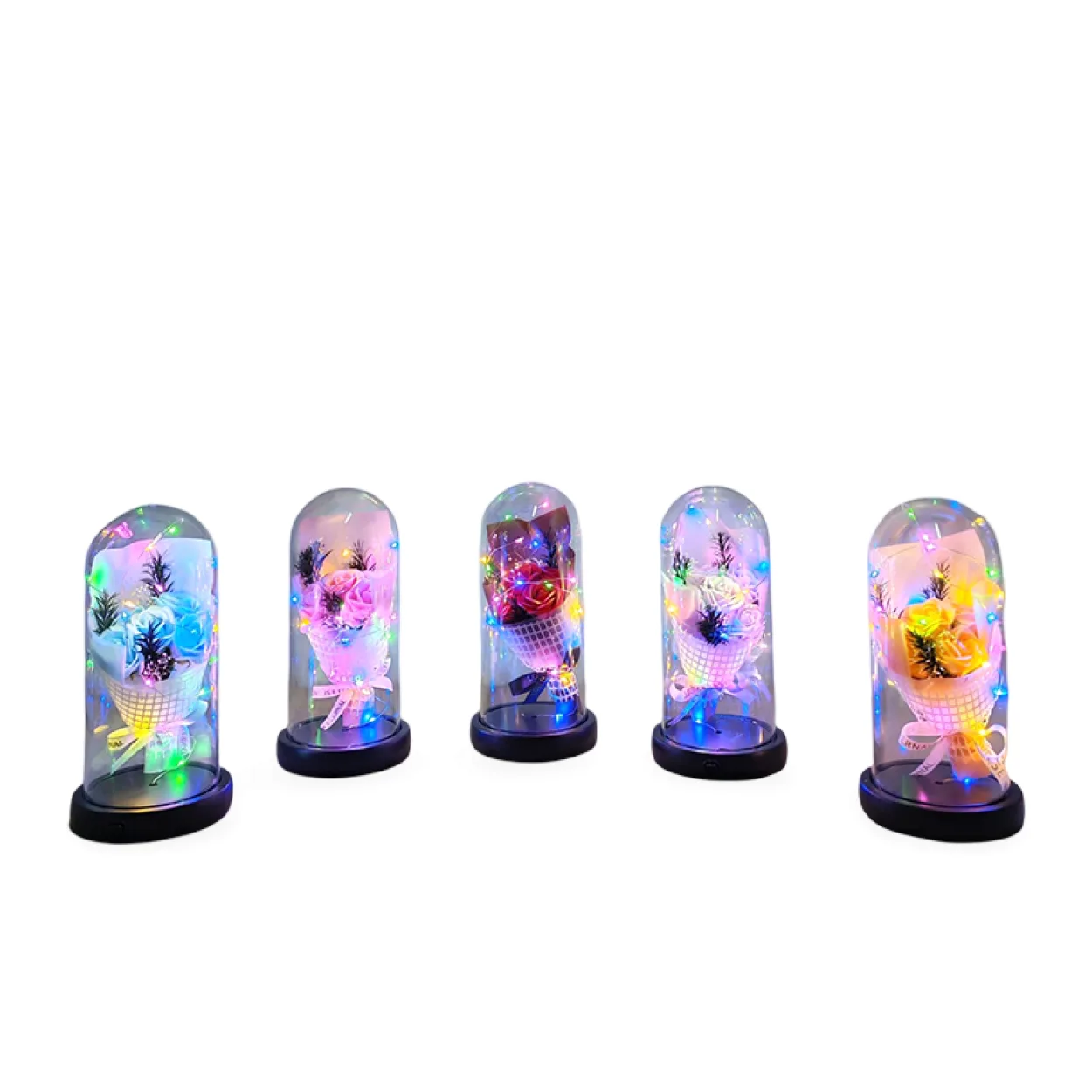 - Büyüleyici Işıklandırma: Fanusun etrafını saran çok renkli LED ışıklar, buketi nazikçe aydınlatarak odanıza sıcak ve davetkar bir ambiyans katar. Gece lambası olarak da kullanılabilir, bulunduğu ortama huzurlu bir parıltı yayar.