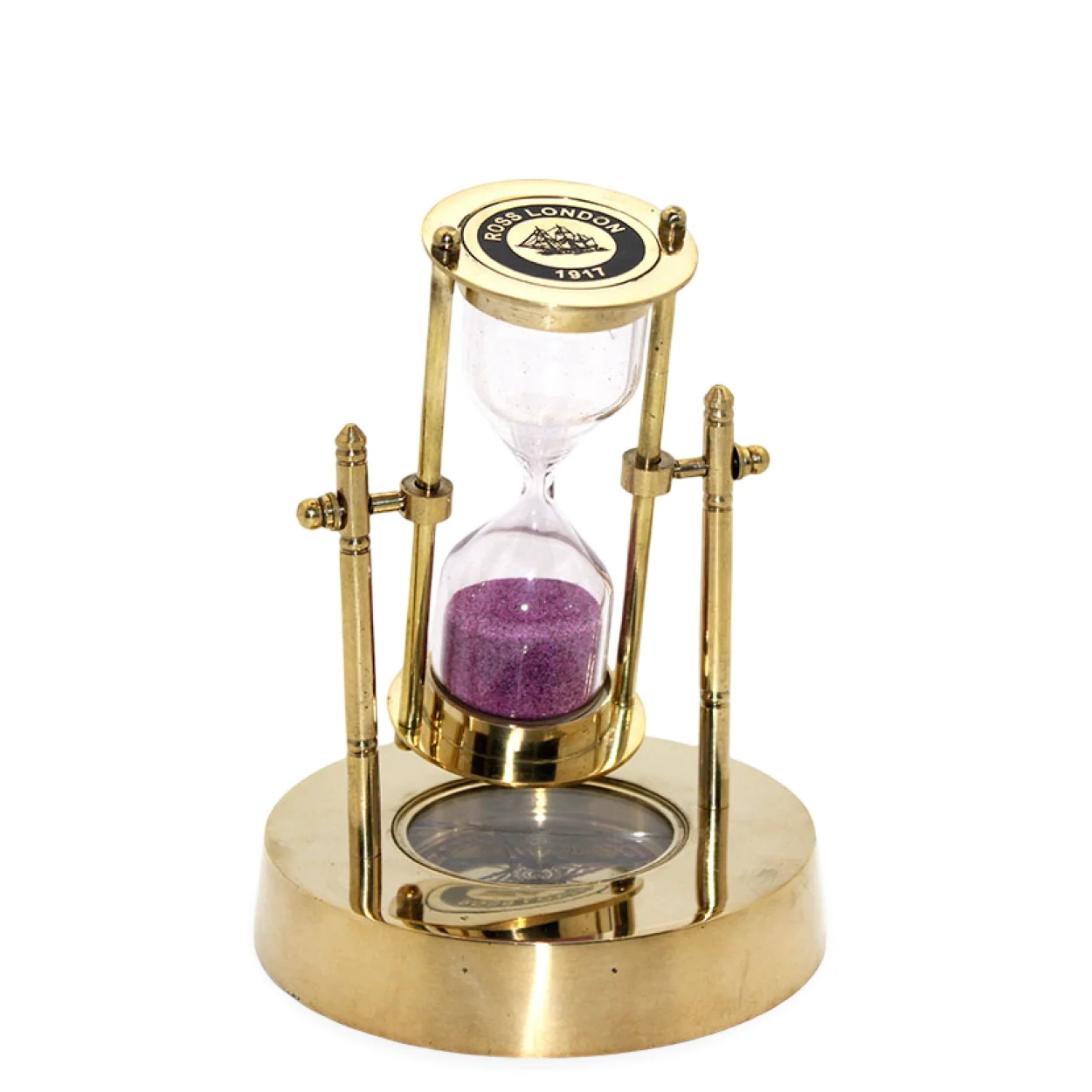 Ürünün en çarpıcı özelliklerinden biri, alt tabanına ustalıkla entegre edilmiş olan pusulasıdır. Bu fonksiyonel pusula, sadece dekoratif bir öğe olmakla kalmaz, aynı zamanda eski kaşiflerin ve denizcilerin kullandığı navigasyon araçlarının ruhunu canlandırır. Kumsaatin içindeki mor renkli, ince öğütülmüş kum, zaman akarken görsel bir şölen sunar. Bu canlı renk, ürünün pirinç gövdesiyle harika bir kontrast oluşturur ve izleyicinin dikkatini çeker. Kumsaatin dönme mekanizması, kumu kolayca ters çevirerek zaman ölçümüne devam etmenizi sağlar, bu da kullanım kolaylığı sunar.