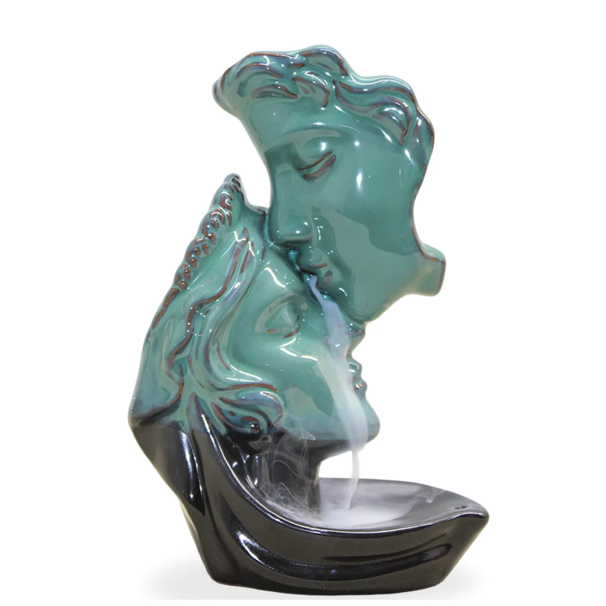Bu benzersiz biblo, yanan geri akış tütsüsünün büyüleyici bir şekilde aşağıya doğru akmasını sağlayarak, dumanın adeta su gibi süzülmesini izleme keyfi yaşatır. Bu özel akış, mekanınızda huzurlu ve meditatif bir ortam yaratırken, aynı zamanda estetik bir ilgi odağı haline gelir. Canlı turkuaz rengi ve koyu siyah tabanıyla modern ve klasik iç mekanlara uyum sağlar, her baktığınızda size aşkı ve dinginliği hatırlatır.