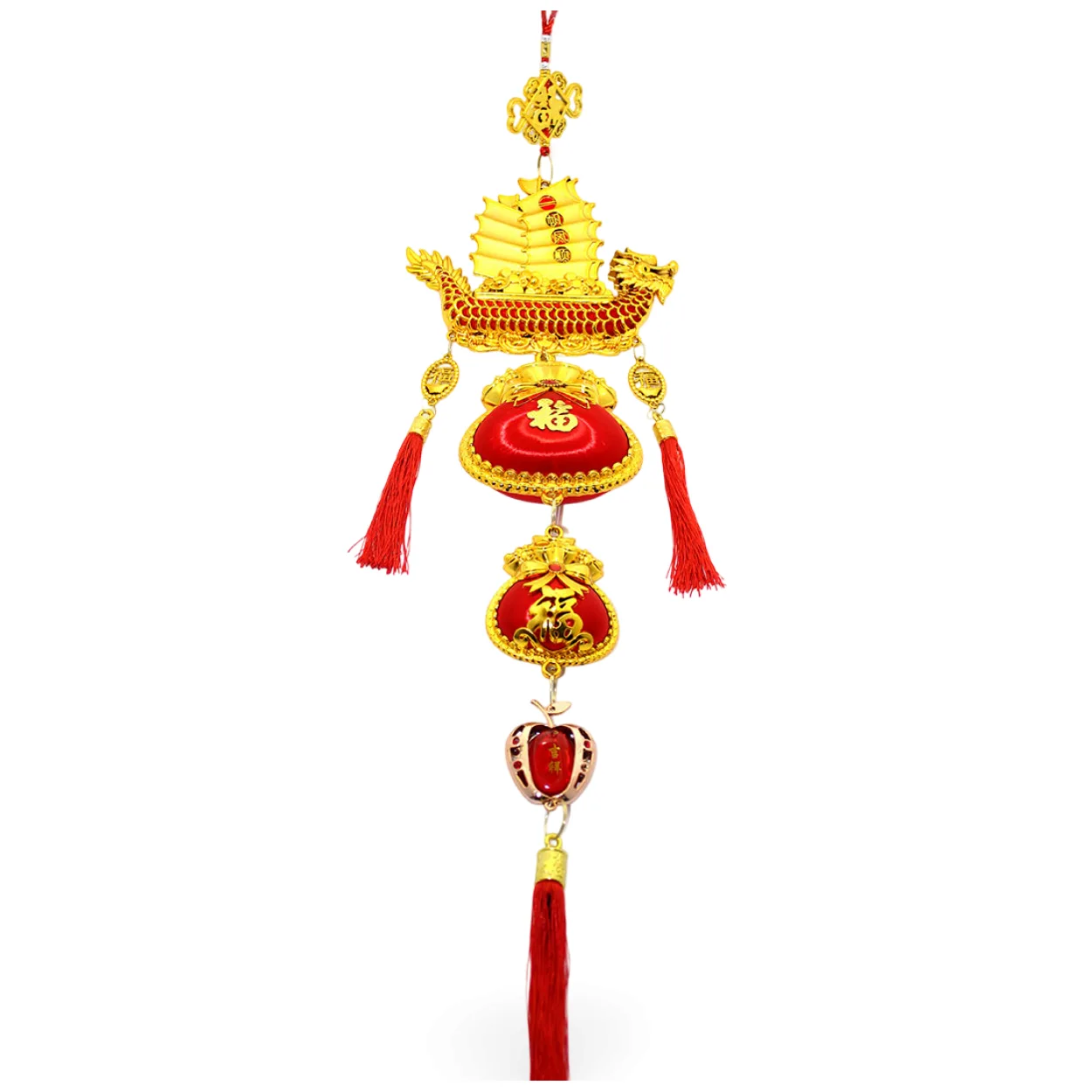 Göz alıcı Şans ve Bereket Dragon Gemisi Askılık ile evinizin, ofisinizin veya iş yerinizin enerjisini yükseltin! Bu eşsiz dekoratif obje, geleneksel Çin kültürünün zenginlik, refah ve iyi talih sembollerini bir araya getirerek yaşam alanlarınıza pozitif bir atmosfer katmak için tasarlandı. Ejderha gemisi, üzerine işlenmiş bereket (福 - fú) karakterli keseler ve şans elması detaylarıyla, sadece bir askılık değil, aynı zamanda anlamlı bir dilek ve inanç objesidir.
