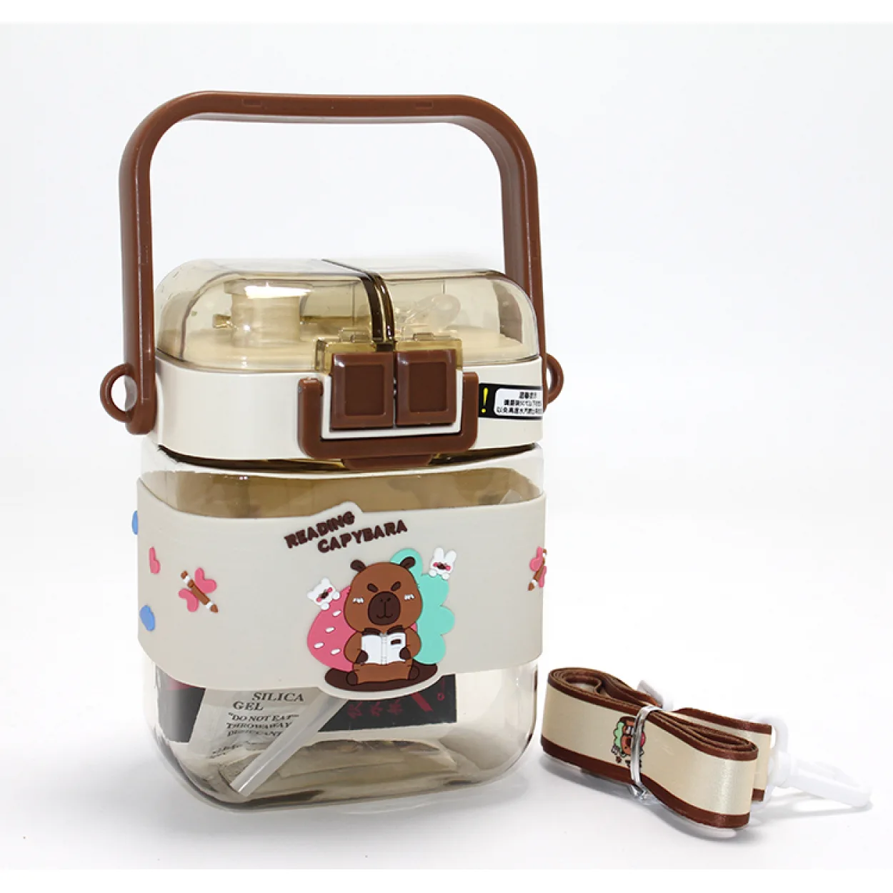 Sevimli Okuyan Kapibara Desenli Çift Bölmeli Pipetli Taşınabilir Çocuk Matarası Suluk