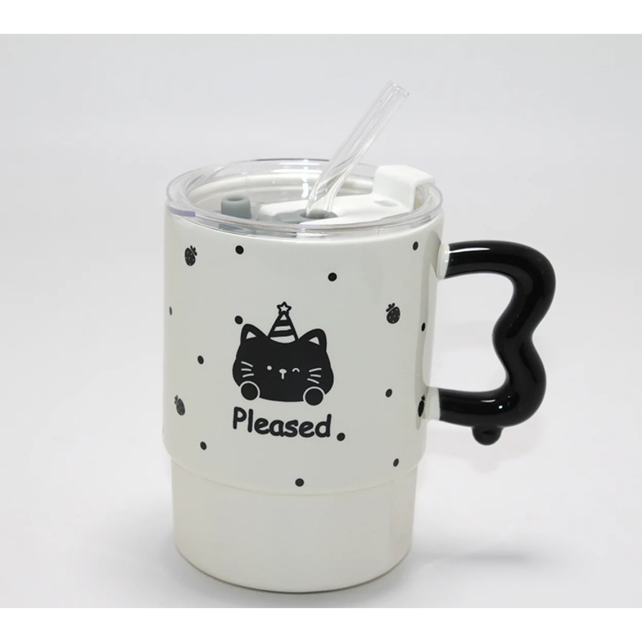 - Şirin Kedi Tasarımı: Parti şapkası ve "Pleased." yazısıyla süslenmiş sevimli kedi figürü, kupaya neşeli ve özgün bir hava katar.