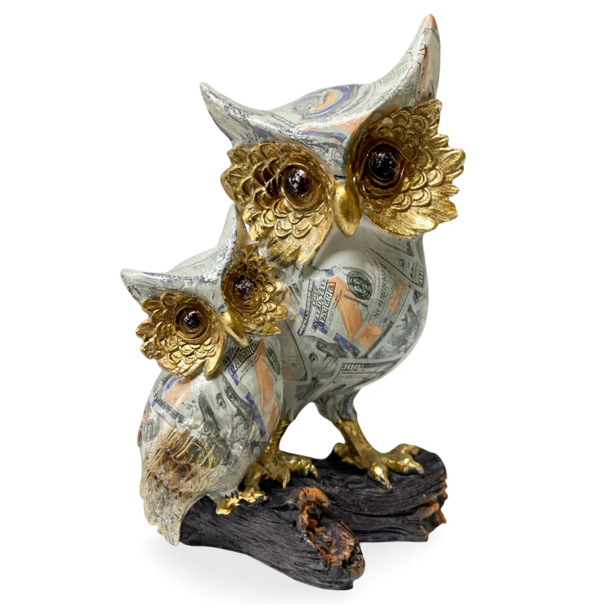 Baykuşların bilgeliğini ve zenginlik sembolü para desenini bir araya getiren bu eşsiz biblo, üzerindeki detaylı Amerikan Doları motifleriyle dikkat çekiyor. Altın rengi gözleri ve ayaklarıyla parıltılı bir görünüm sunarken, ana gövdesindeki mermer görünümlü gri ve beyaz tonlar, objeye sanatsal bir derinlik katıyor. Kaliteli polyester malzemeden üretilmiş olup, uzun ömürlü ve dayanıklı bir yapıya sahiptir.