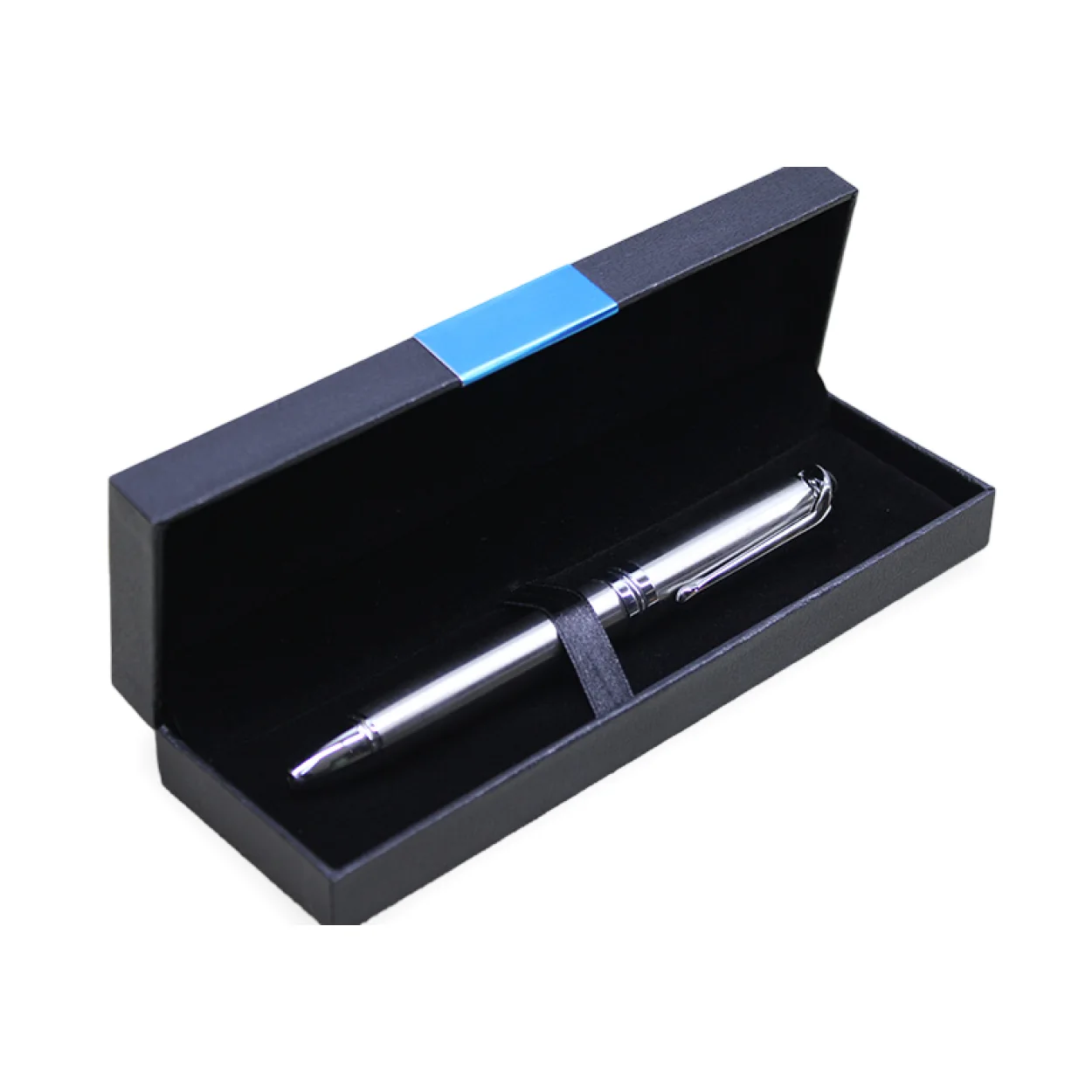 Kutulu Tekli Tükenmez Kalem: Ürün, özel tasarım siyah hediye kutusu içerisinde tekli olarak sunulmaktadır. Kutu içerisindeki siyah kadife yuva ve kurdele, kalemin güvenli ve şık bir şekilde muhafaza edilmesini sağlar. Kutunun kapağındaki mavi detay ise modern bir dokunuş katmaktadır.