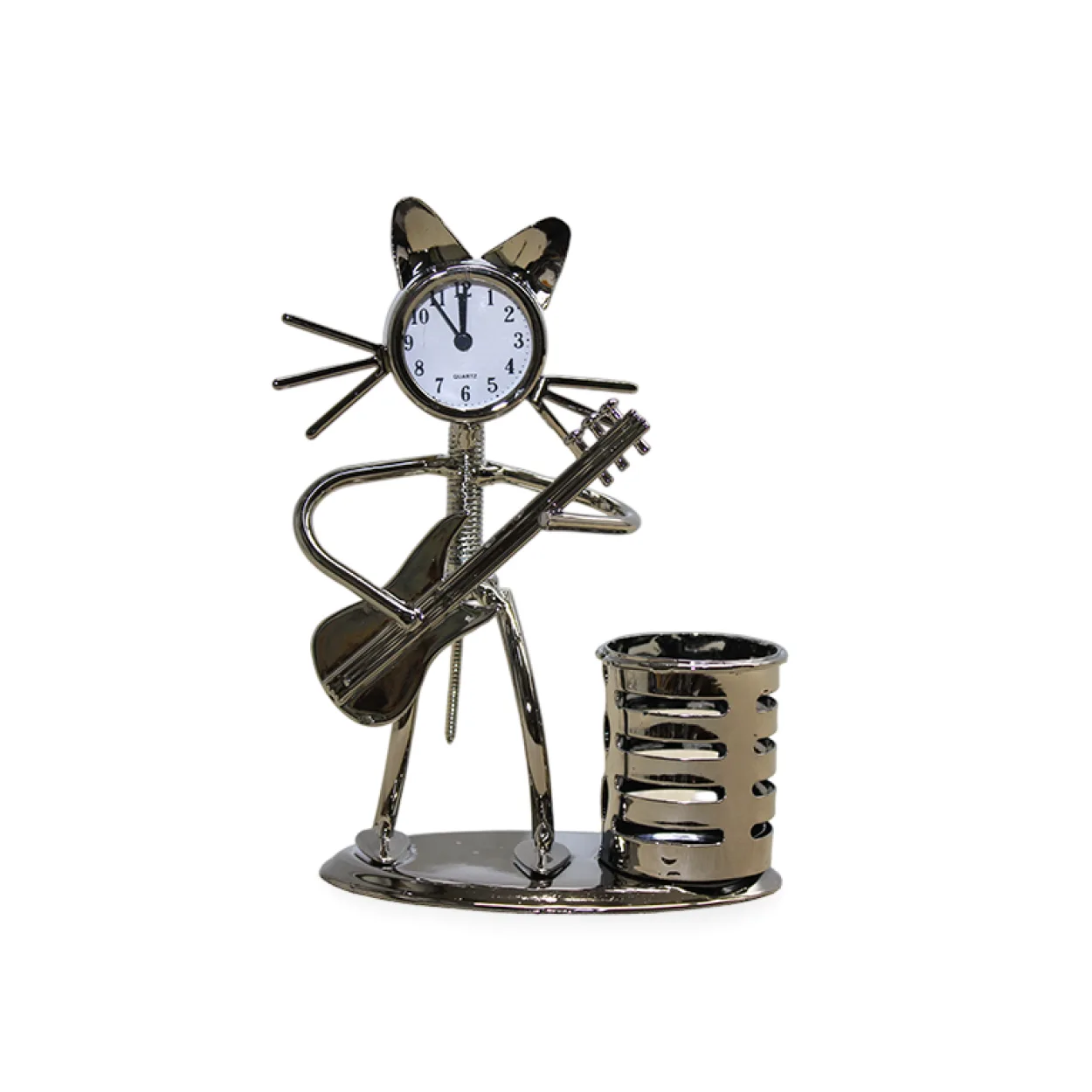 Şık Metal Kedi Müzisyen Masa Saati ve Kalemlik – Gitar Çalan Dekoratif Obje