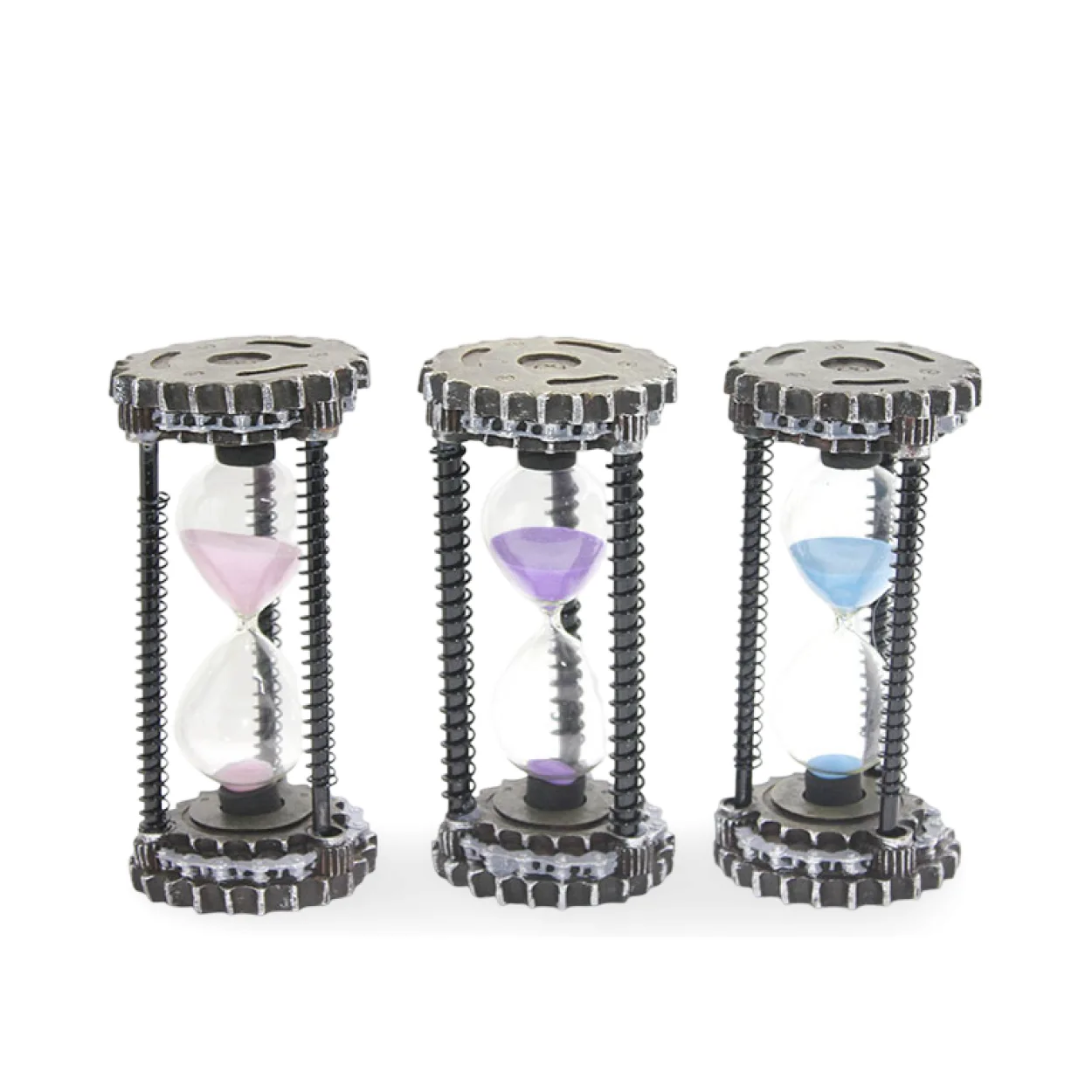 Şeffaf cam haznesinde akıp giden renkli kum (pembe, mor veya mavi seçenekleri mevcuttur) sadece zamanı değil, aynı zamanda görsel bir şöleni de temsil eder. Bu kum saati, hem estetik bir biblo hem de dikkat çekici bir zamanlayıcı olarak işlev görür. Çalışma masanızda, kitaplığınızda veya ofisinizde odak noktası olacak, sohbetlere ilham verecek bir parçadır.