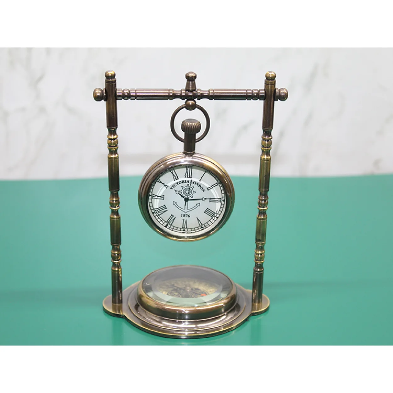Ürünün pirinç malzemeden özenle işlenmiş ayaklı tasarımı, dayanıklılığı ve estetiği bir arada sunar. Saatin beyaz kadranı, klasik Roma rakamları, 'Victoria London 1876' yazısı ve zarif çapa motifi ile döneminin ruhunu yansıtır. Detaylara verilen önem, saatin her bir milimetrekaresinde kendini gösterir. Alt kısmında yer alan işlevsel pusula, bu dekoratif parçaya maceraperest bir ruh ve kullanışlı bir özellik katmaktadır. Kütüphanenizde, çalışma masanızda veya bir koleksiyon rafında merkez parçası olmaya adaydır.