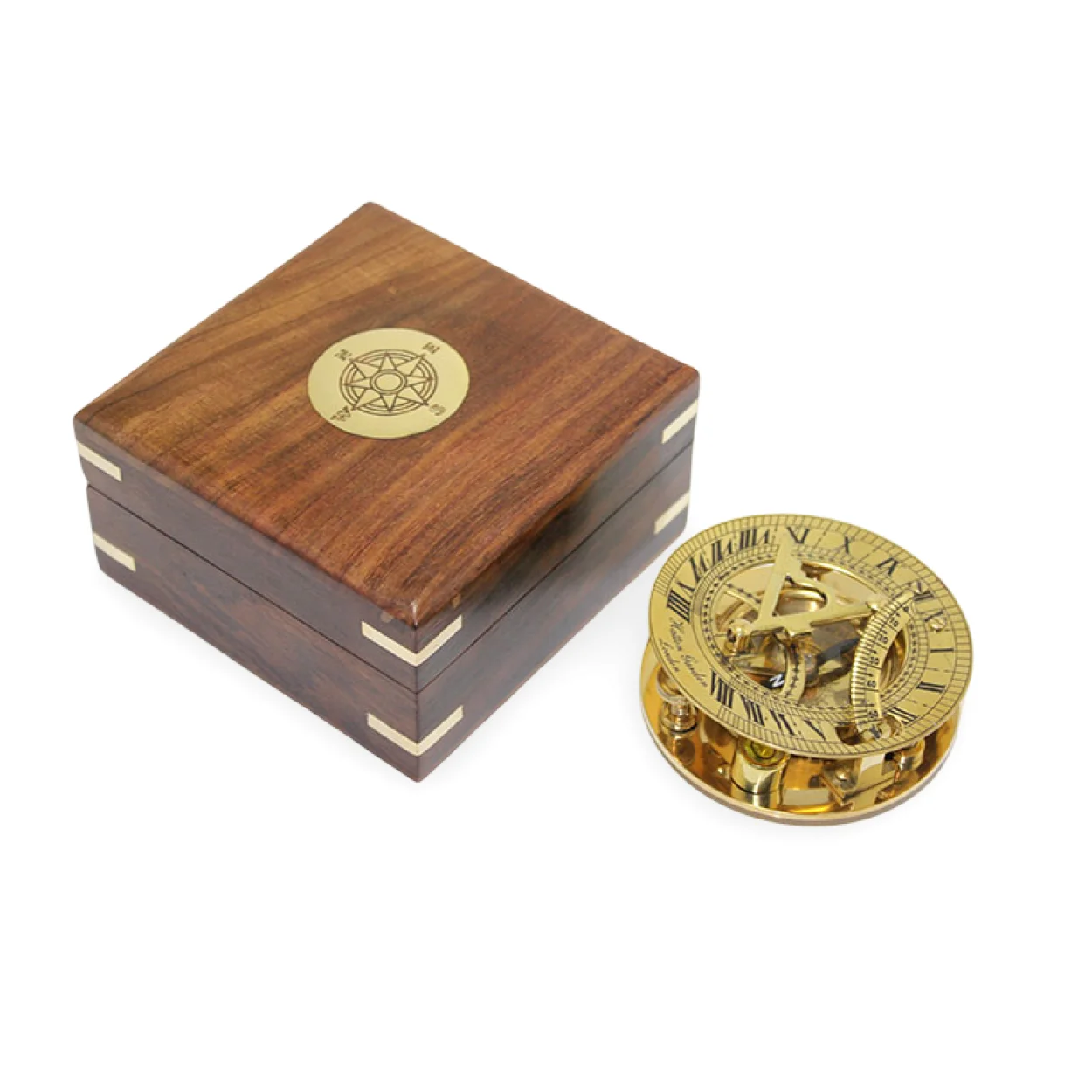 Vintage Pirinç Güneş Saati & Pusula Seti Ahşap Kutulu | Koleksiyonluk Şık Dekoratif Hediye
