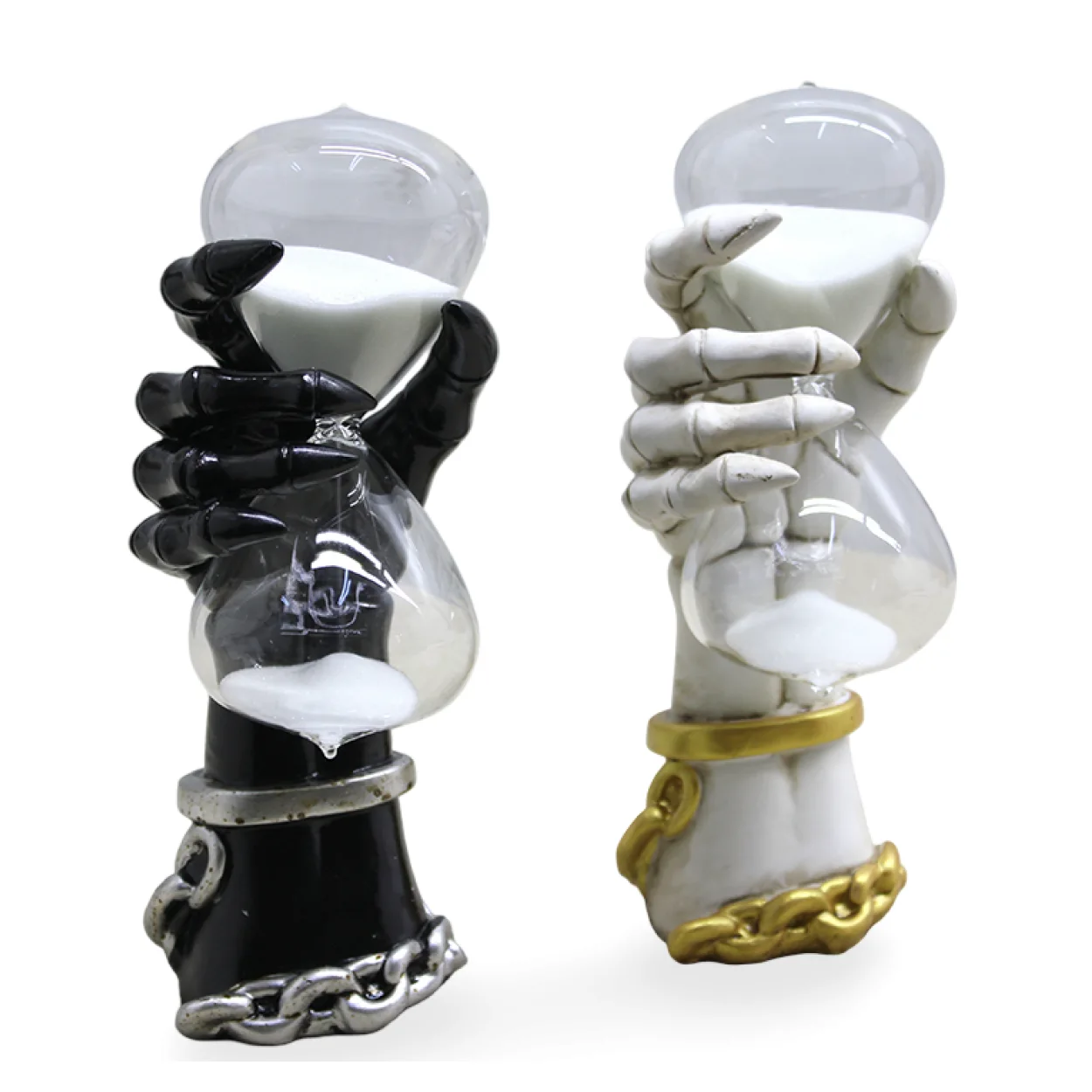 Ürünün en belirgin özelliği, kum saatini saran detaylı el tasarımıdır. Siyah veya kemik rengi seçenekleriyle, gotik ve modern estetiği bir araya getiren bu eşsiz tasarım, mekanınıza karakter katacaktır. Her bir kum tanesi akarken, zamanın geçişini izlemek adeta bir meditasyona dönüşür. Bu obje, çalışma masanızda, kitaplığınızda veya herhangi bir köşede göz alıcı bir odak noktası oluşturur.
